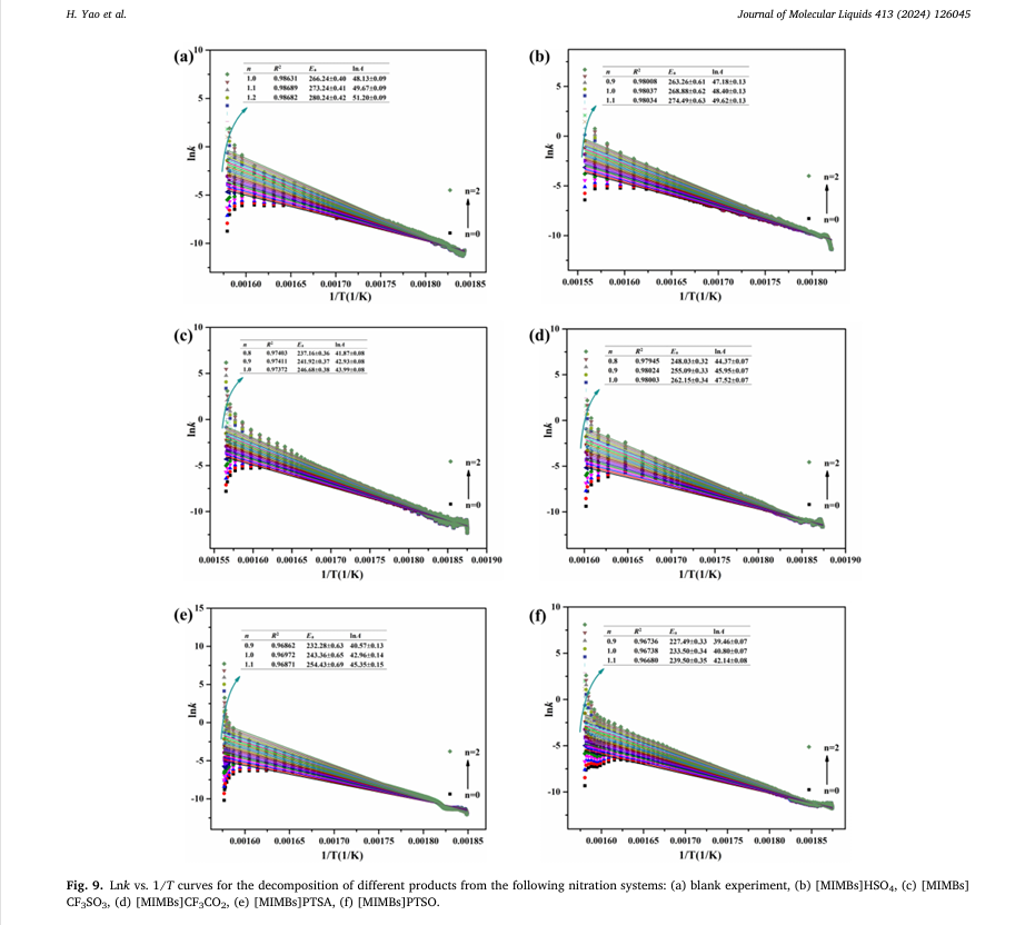 TAC-500A绝热加速量热仪集成了多种反应动力学分析方法。在反应机理模型不明确的情况下,为避免预设模型不匹配带来的误差,可选择等转化率法进行参数拟合;而对于具有明确n级反应动力学方程,则可直接采用速率常数法进行拟合。本研究采用了速率常数法进行计算,结果表明,与单硝基化产物相比,双硝基化产物的分解需要额外的能量来启动。