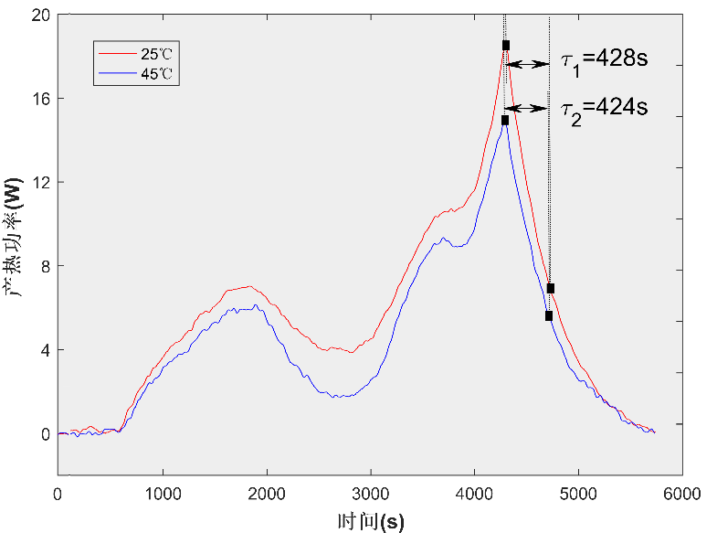 不同工作温度下电池产热特性存在差异。如图4,在45℃条件下#3电池产热功率略小于25℃下的结果,但两者的热滞后时间常数基本一致。可以初步认为温度与热滞后没有明显关联性,这可能是由于温度小幅度变化对系统传热特性几乎没有影响。