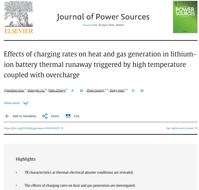 上海交通大学韩东教授课题组郭岍桢博士等在期刊 Journal of Power Sources 上发表论文 Effects of charging rates on heat and gas generation in lithium-ion battery thermal runaway triggered by high temperature coupled with overcharge