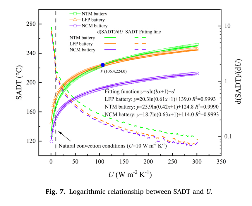 在电池储存和运输场景中,当环境温度(T0)升高到一定程度,系统放热速率大于散热速率,导致电池温度持续上升,直至触发电池热失控。此临界温度 (T0) 即为 SADT。本研究基于BAC-90A测试的热特性参数,结合热平衡方程和谢苗诺夫模型。计算出了三种电池的自加速分解温度(SADT)与系统表面传热系数(U)的对数关系。为评估电池在不同散热条件下的热失控临界性提供量化依据。