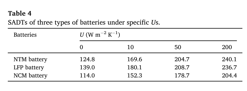 3. 在自然对流条件下,当储存温度超过169.6 ℃时,完全充电的NTM电池会自燃。在电池储存和运输过程中增加系统表面传热系数U已被证明可以显著提高NTM电池相对于LFP和NCM电池的安全性。