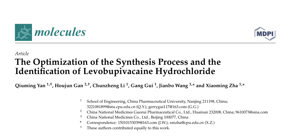 中国药科大学工学院查晓明教授团队在Journal | [J] MoleculesIF:4.2)发表题为The Optimization of the Synthesis Process and the Identification of Levobupivacaine Hydrochloride论文,该成果由中国药科大学工学院、国药集团国瑞药业有限公司及中国民族医药股份有限公司等机构联合支持。