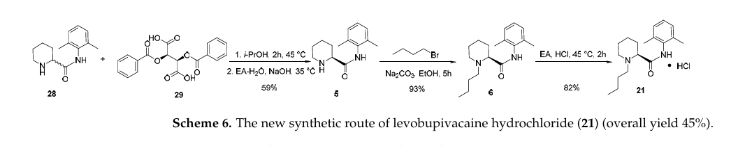 本研究从起始原料的可用性和成本效益、操作简便性、绿色环保、设备可及性、工业化可行性、优化的手性合成和安全性等维度考虑,优化和改进了一种更可行的盐酸左布比卡因(21)合成工艺(Scheme 6),这种新方法能克服现有方法的复杂性和高成本,有利于促进大规模工业化生产。