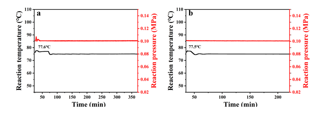 1.使用反应量热法,在两组反应条件下,反应过程中均未观察到明显的放热或压力升高。两组反应的最大反应温度分别为77.6°C和77.5°C,均低于溶剂的沸点。
