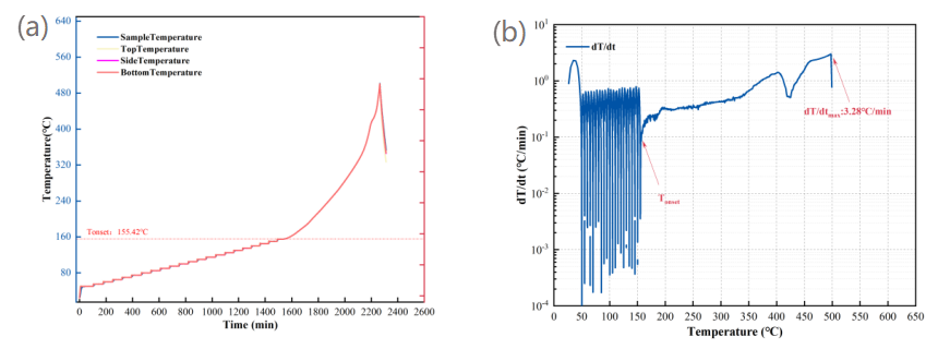本次实验采用BAC-90A小型电池绝热量热仪的HWS模式测试纤维锂电池热失控过程。该实验模式能够准确测量得到锂电池自放热起始温度(T1)、热失控起始温度(T2)等关键电池热安全参数。
