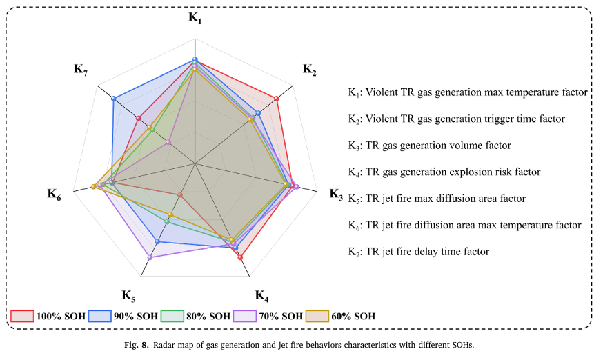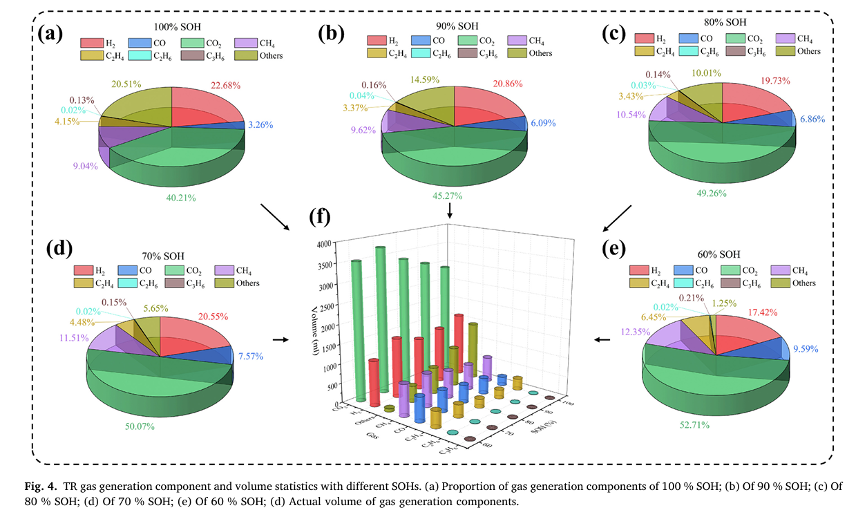 本研究还通过开展不同SOH电池的热失控喷射火行为实验,结合热失控产气参数进行应用场景下的综合特性分析,为储能系统及电动汽车的电池管理系统(BMS)安全设计提供了关键技术指导。
